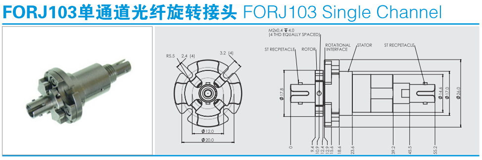 FORJ103光纖旋轉(zhuǎn)接頭用于單模或多模系統(tǒng)的光電旋轉(zhuǎn)連接;完全的雙向旋轉(zhuǎn);與現(xiàn)有的電氣滑環(huán)設(shè)計相融合;全封閉結(jié)構(gòu);能為客戶量身定制所需要的光纖滑環(huán)