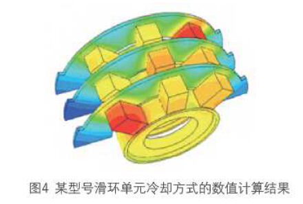 同時(shí),對(duì)該型號(hào)電滑環(huán)采用數(shù)值計(jì)算的方法進(jìn)行分析,之后可以將計(jì)算結(jié)果與測(cè)試結(jié)果進(jìn)行比對(duì),通過(guò)這種計(jì)算與實(shí)驗(yàn)相結(jié)合的方法來(lái)分析其冷卻系統(tǒng)的性能。溫度分布的數(shù)值計(jì)算結(jié)果如圖4所示。