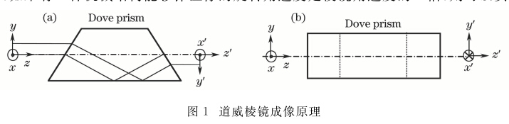 道威棱鏡是一種去掉頂端多余部分的直角棱鏡,當光線從棱鏡的一端以平行棱鏡底面的方向平行入射時,經(jīng)過兩次折射和一次反射后以同樣的方向平行射出。 圖1是道威棱鏡成像的原理。 在圖1(a)中,物體經(jīng)過道威棱鏡后,成的像是上下顛倒(即狔 方向發(fā)生改變);當棱鏡繞光軸旋轉(zhuǎn)90°后,成的像左右顛倒(即狓方向發(fā)生改變),如圖1(b)所示。 也就是說,當棱鏡繞光軸旋轉(zhuǎn)90°時,成的像也繞光軸旋轉(zhuǎn),而且旋轉(zhuǎn)角度為180°。 所以,如果有一種機械結(jié)構(gòu)能夠保證像的旋轉(zhuǎn)角速度是棱鏡角速度的2倍,則可以實現(xiàn)消旋。