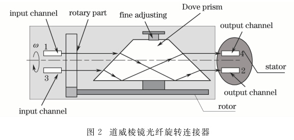 在圖2中,假如入射端光線(如1和3)以角速度ω 繞轉(zhuǎn)動軸旋轉(zhuǎn),同時道威棱鏡以ω/2角速度轉(zhuǎn)動時,出射光線(如2和4)的位置保持不變。 當該系統(tǒng)用于圖像傳輸時,在棱鏡的特征方向上,出射方向上的像是入射方向上像的倒像,即以右手坐標入射的光,在出射端變?yōu)樽笫肿鴺讼怠?br />