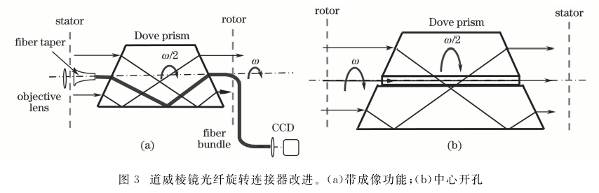 法國Thales公司 ThomasMerlet等在道威棱鏡的幾何中心開一小孔(或在幾何中心的入射面和出射面處切掉一小塊,使光能垂直玻璃表面入射和出射),光在該通道通過時不會發(fā)生偏轉(zhuǎn),因此通過道威棱鏡不會發(fā)生損耗,如圖3(b)所示。 對于一般的道威棱鏡滑環(huán)而言,因為存在制造誤差,在光學傳輸路徑上容易產(chǎn)生強度和長度的波動,在旋轉(zhuǎn)過程中,棱鏡存在的同軸度誤差使插入損耗發(fā)生變化。 當人們需要傳輸模擬信號時,例如,連續(xù)數(shù)量的大幅度擺動的信號時,這些干擾將是致命的。 如果采用中心孔通道傳輸,就可以克服這些缺點,同時,其他的通道可以提供給那些對損耗變化不那么敏感的信號使用。
