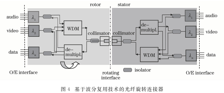 WDM 是同時將多個波長的光在一根光纖中傳輸,提高了系統(tǒng)的傳輸容量,支持雙向信號傳輸。 利用WDM 這一技術(shù)特性,可構(gòu)成多通道光纖滑環(huán),實現(xiàn)大容量、低損耗和高速度數(shù)據(jù)傳輸。采用波分復用技術(shù)的多通道光纖滑環(huán)的結(jié)構(gòu)如圖4所示。 多束波長分別為λ1,λ2 和λn 的光通過耦合隔離器(隔離器主要是防止從另一端反射回來的光束對入射光產(chǎn)生干擾),然后進入波分復用器中,多束光被合成一束光。 這束光經(jīng)過微透鏡擴束準直后,通過連接器的旋轉(zhuǎn)界面。 在出射端,再通過微透鏡接收會聚,耦合到輸出端的解波分復用器(demultiplexer)中,由解分波復用器將一束光分解成多束光。 需要說明的是,在這種對稱結(jié)構(gòu)中,光的傳輸是雙向的。 在實際應(yīng)用中,可以將音頻信號、視頻信號和數(shù)據(jù)等分別調(diào)制到不同的波長上,