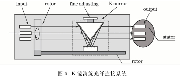 Moog公司利用45°反射鏡實現(xiàn)多路光纖信號的傳輸,如圖5所示。 圖中定子是固定不動的,入射光纖的光經(jīng)過反射鏡反射后,進入會聚透鏡,然后再通過光纖將光信號傳出。 反射鏡通過磁耦合齒輪與轉(zhuǎn)子連接,當轉(zhuǎn)子轉(zhuǎn)動時,在磁力作用下,保持反射鏡不動,從而使光線始終與準直透鏡相對。當45°掃描鏡用于圖像傳輸時,會產(chǎn)生像旋轉(zhuǎn)。 由于鏡面反射使得物與像的坐標“顛倒”,所以奇數(shù)次反射成鏡像,而偶數(shù)次反射成物象。 Trex公司采用三反射面系統(tǒng)實現(xiàn)消除像偏轉(zhuǎn),因其三面反射鏡呈“K” 字排列,故起名“K 鏡”,如圖6所示。